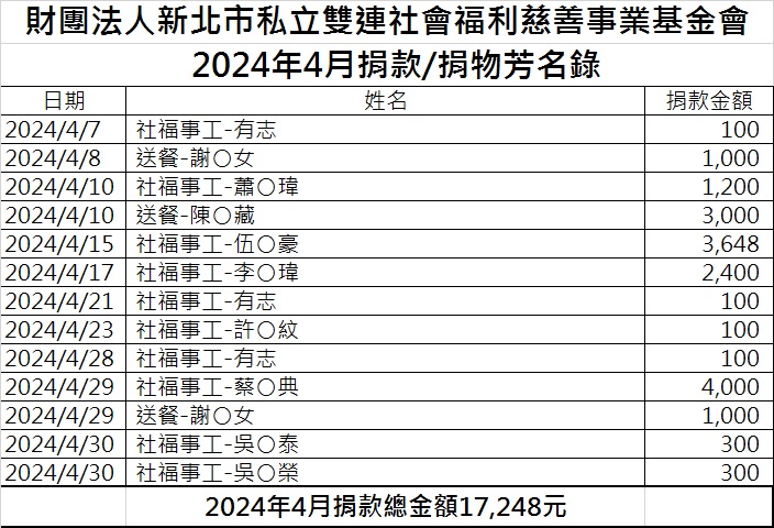 113年4月份捐款徵信芳名錄