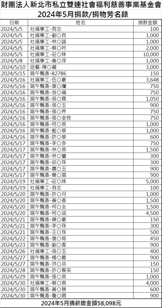 113年5月份捐款徵信芳名錄