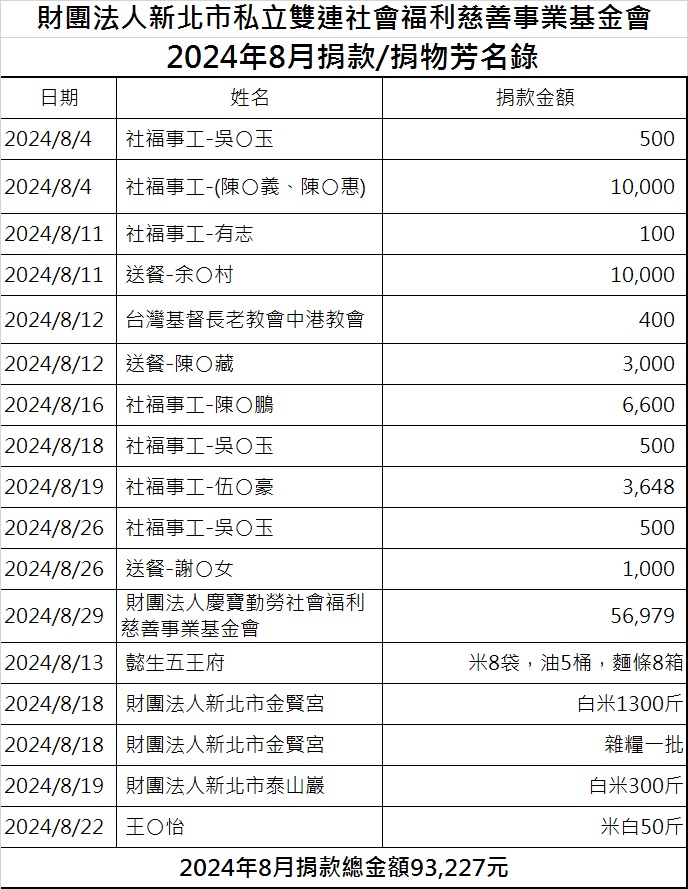 113年8月份捐款徵信芳名錄