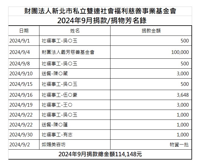 113年9月份捐款徵信芳名錄