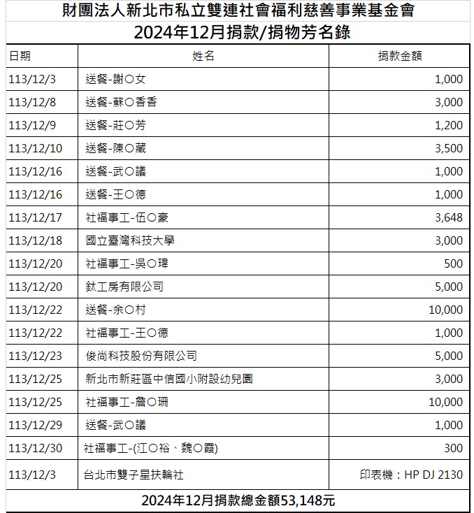 113年12月份捐款徵信芳名錄