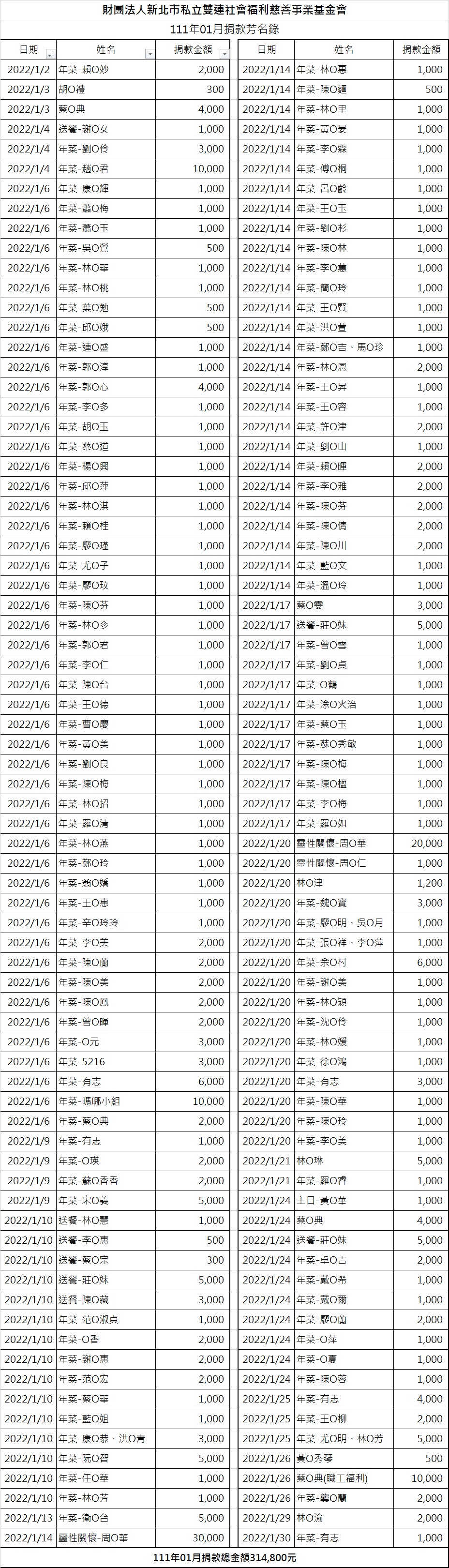 111年01月份捐款徵信芳名錄