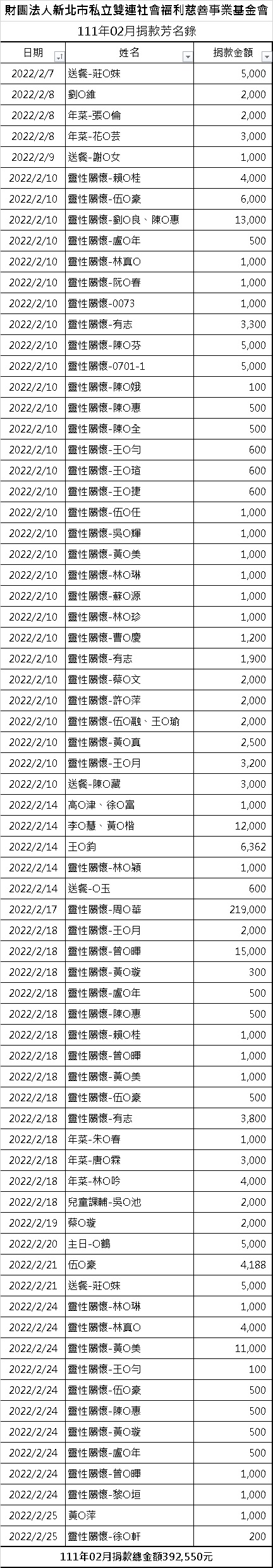 111年02月份捐款徵信芳名錄