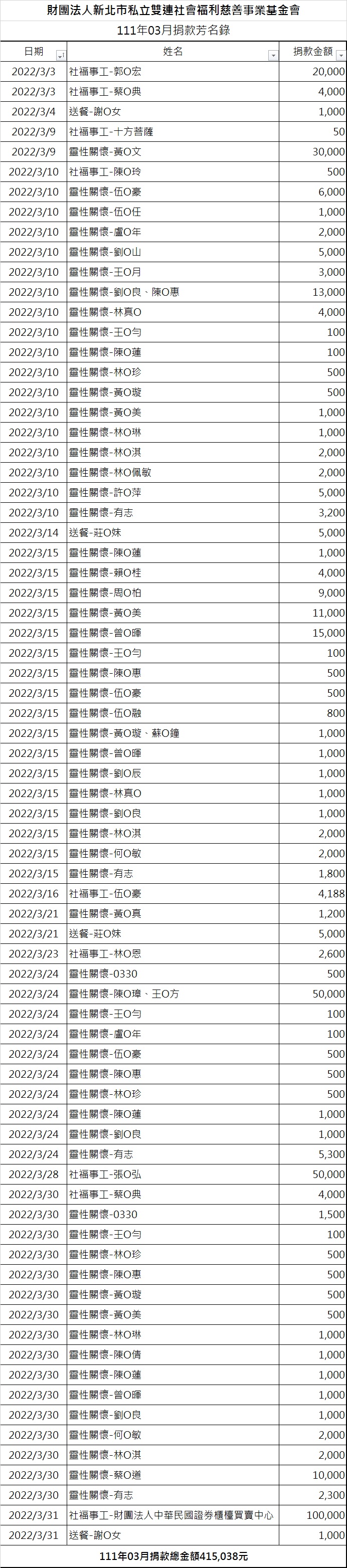 111年03月份捐款徵信芳名錄