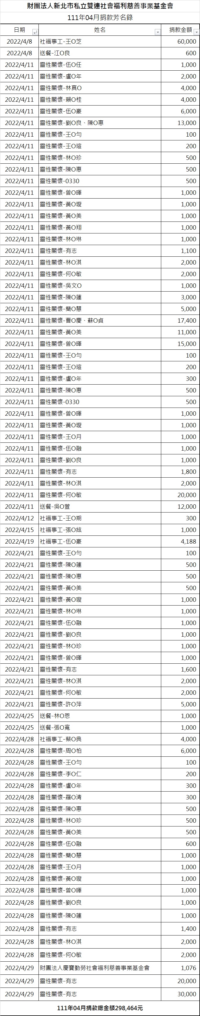 111年04月份捐款徵信芳名錄