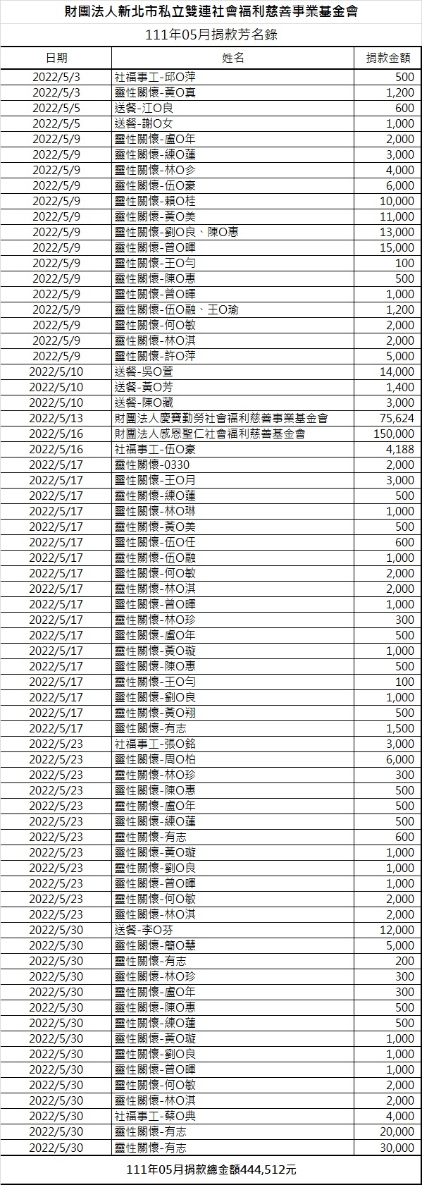 111年05月份捐款徵信芳名錄